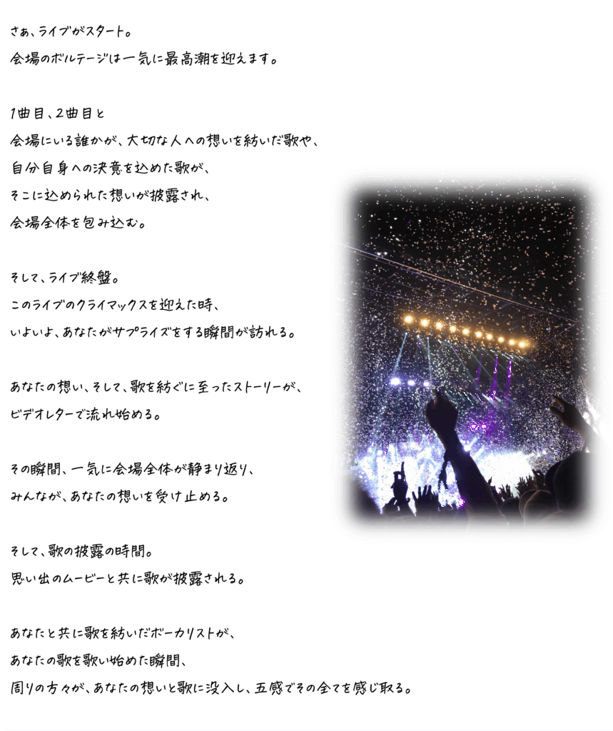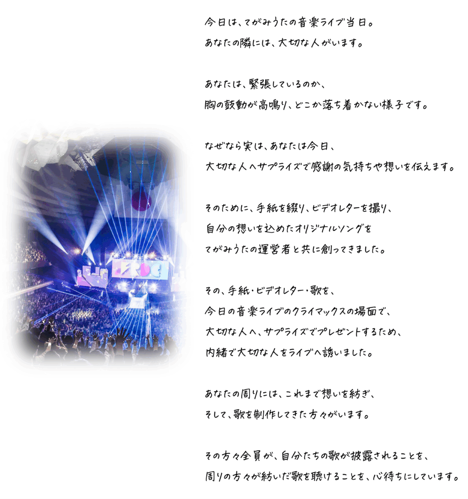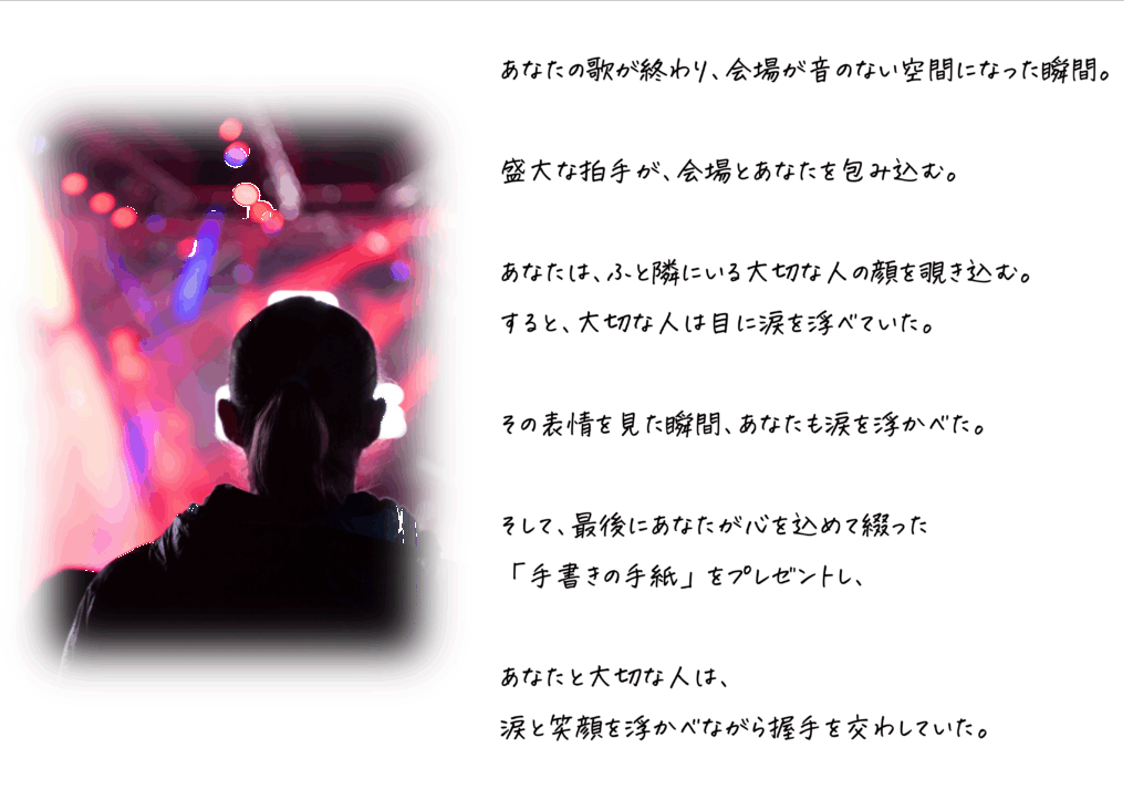 卒業・退職・忘年会・同窓会・誕生日・還暦・会社の周年・記念日… これまであなたが歩まれてきた人生は歴史そのものです。てがみうたでは、そんな、これまで歩まれてきた人生や思い出、これからの未来へ向けての決意の想いを、ストーリーとして全身で感じられる/振り返られるキッカケを提供致します。